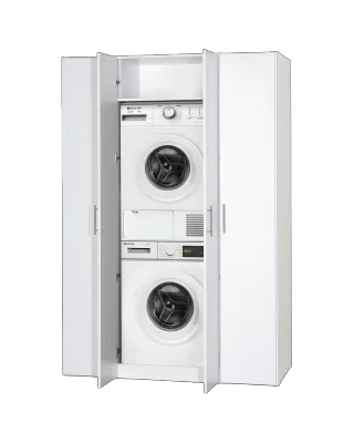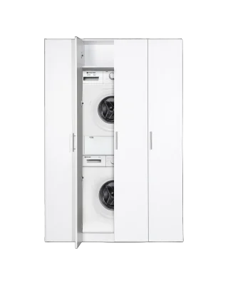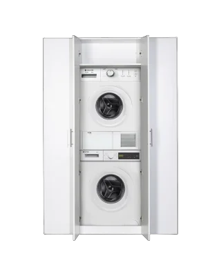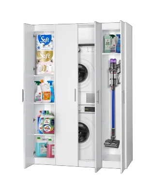 פתרון אחסון חכם ומעוצב לחדר השירות שלך – ארון גדול, פונקציונלי ונוח במיוחד, הכולל מקום ייעודי למכונת כביסה ולמייבש, לצד אזורי אחסון רחבים לחומרי ניקוי, מגבונים, שואב אבק אלחוטי וציוד תחזוקה נוסף.